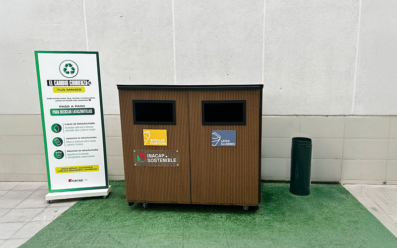 En INACAP Sede Maipú contamos con dos puntos de reciclaje que promueven la gestión responsable de residuos y el compromiso con la sostenibilidad institucional.