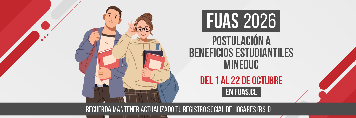 Entre el 01 al 22 de octubre estará disponible el Formulario Único de Acreditación Socioeconómica (fuas.cl), para realizar la postulación a la Gratuidad y Beneficios Estudiantiles del MINEDC para la Educación Superior 2026.