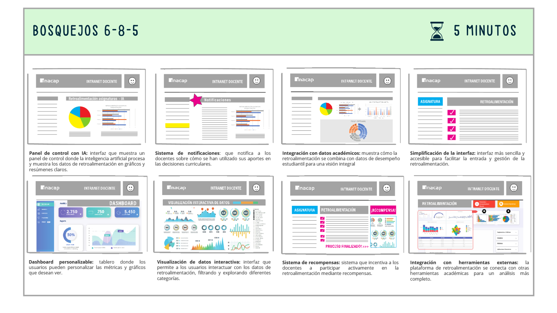 - Después de los 5 minutos, se recogen los bosquejos y se repite otro ciclo de 5 minutos para generar 6 a 8 bosquejos más. Este ciclo se puede repetir las veces que el equipo estime conveniente.