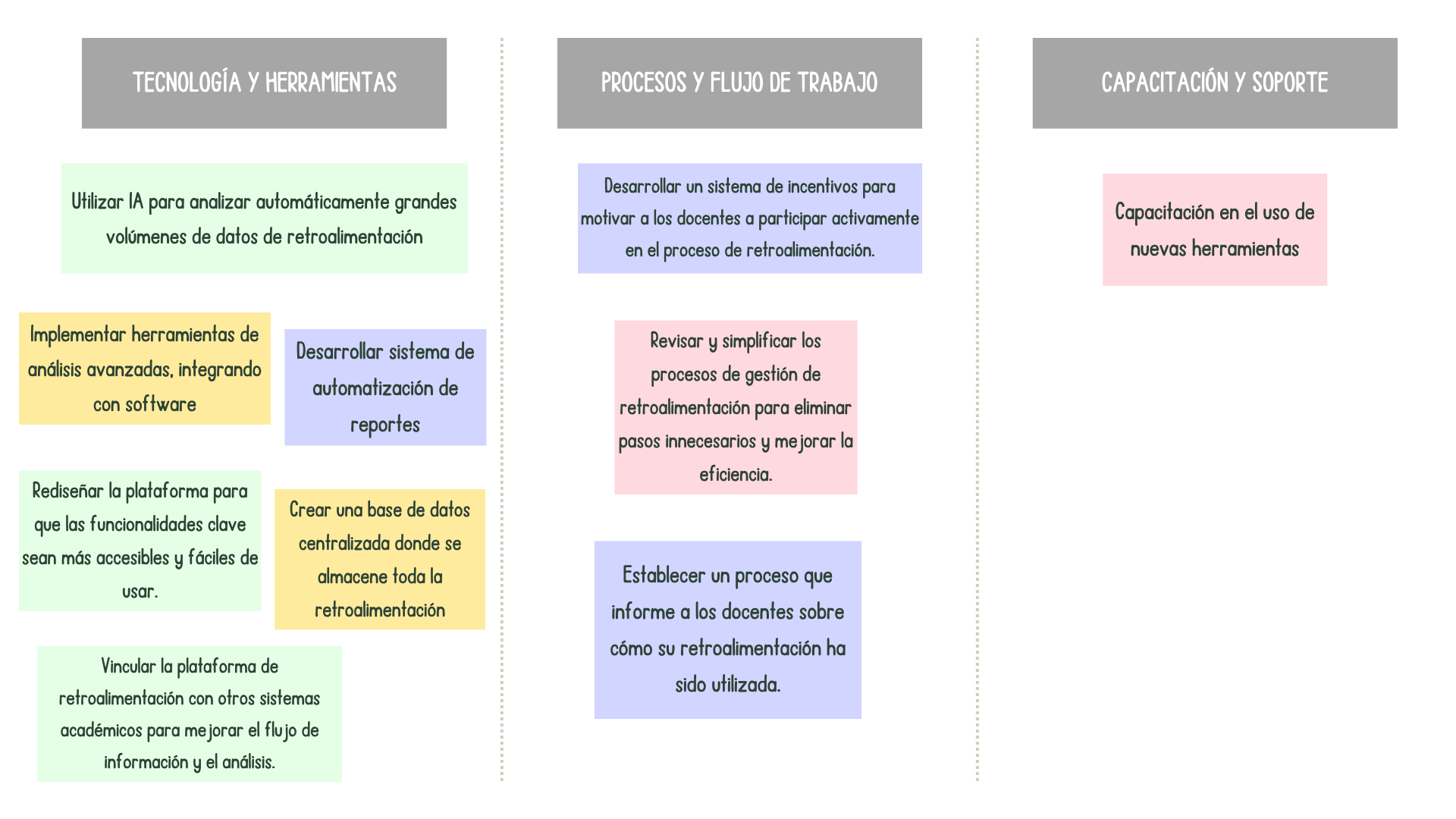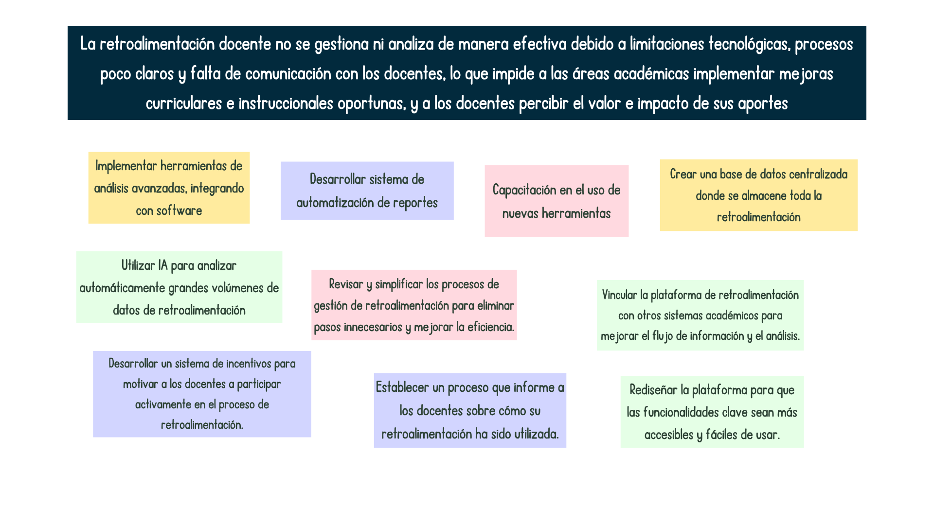 “La retroalimentación docente no se gestiona ni analiza de manera efectiva debido a limitaciones tecnológicas, procesos poco claros y falta de comunicación con los docentes, lo que impide a las áreas académicas implementar mejoras curriculares e instruccionales oportunas, y a los docentes percibir el valor e impacto de sus aportes.”