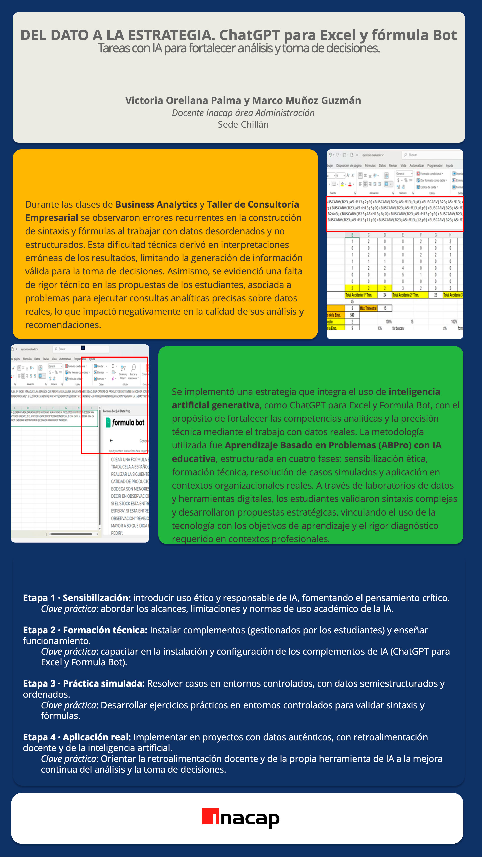 En este video, Victoria Orellana y Marcos Muñoz, docentes del área de Administración en sede Chillán, presentan la práctica DEL DATO A LA ESTRATEGIA. ChatGPT para Excel y fórmula Bot. Tareas con IA para fortalecer análisis y toma de decisiones, una experiencia que integra IA educativa como apoyo pedagógico para fortalecer la precisión técnica y el razonamiento analítico. A través de cuatro etapas (sensibilización ética, formación técnica, práctica en entornos simulados y aplicación con datos reales), la IA opera como mentor: ayuda a depurar sintaxis, explicar la lógica y validar consultas, sin sustituir el esfuerzo cognitivo. El resultado: mayor rigor en los informes, mejor interpretación de datos, aumento en motivación y participación, y una conexión más sólida entre análisis y decisiones estratégicas.