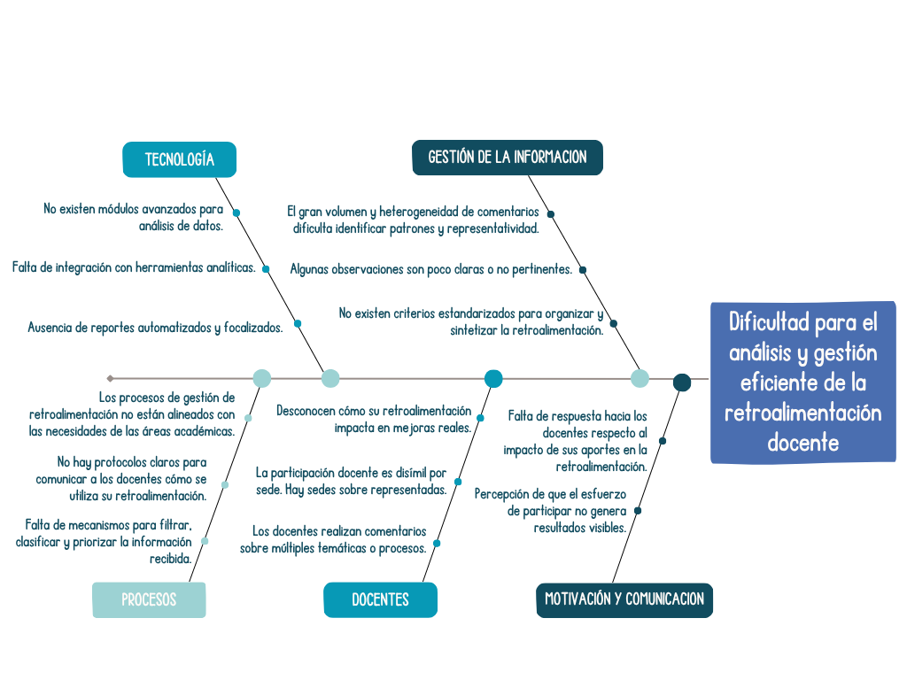 - Definir el efecto: docentes y áreas académicas no cuentan con retroalimentación que sea gestionada y analizada de manera eficiente, lo que limita su capacidad de implementar mejoras curriculares e instruccionales y reduce la percepción de los docentes sobre el impacto de sus aportes.