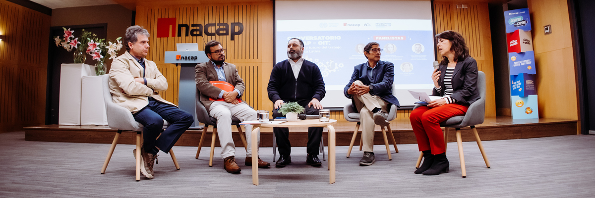 El espacio fue moderado por Alejandra Villarzú, Asesora de la Subsecretaría de Educación Superior del Ministerio de Educación, y contó con la participación de Domingo Claps, Analista del Departamento de Intermediación y Prospección Laboral de la Subsecretaría del Trabajo; Juan Eduardo Carmach, Director de Desarrollo de SOFOFA Futuro del Trabajo; Juan Bravo, Director del Observatorio del Contexto Económico; y Juan Jacobo Velasco, Oficial de la OIT.