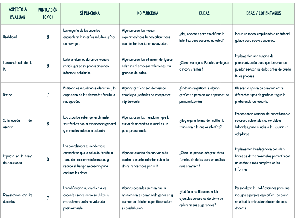 - Se ejecuta el testeo, permitiendo que los usuarios naveguen por la nueva interfaz, utilizando la IA para analizar datos ficticios de retroalimentación docente. Los observadores del testeo toman notas sobre las reacciones de los usuarios, así como cualquier dificultad o comentario positivo que surja.