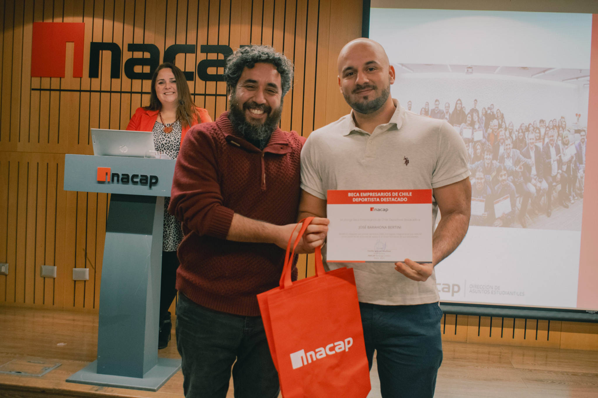 Asimismo, se destacó a José Barahona Bertini con la Beca Deportista Destacado, reconocimiento otorgado a estudiantes que sobresalen en competencias deportivas a nivel regional o nacional. José compartió cómo el waterpolo se convirtió en una herramienta clave para canalizar su hiperactividad desde temprana edad y cómo su madre fue un pilar fundamental en su formación deportiva. A lo largo de su testimonio, destacó la importancia de los valores que entrega el deporte, como la disciplina, el esfuerzo y la responsabilidad; y agradeció a INACAP por el apoyo entregado a través de esta beca, la que le permitirá complementar su formación profesional con su exigente vida deportiva. “Gracias a esta beca voy a poder tener más sustento para comprar mis suplementos, pasajes y todo lo necesario para seguir adelante. Quiero ser no solo un deportista integral, sino también un profesional integral”, afirmó.