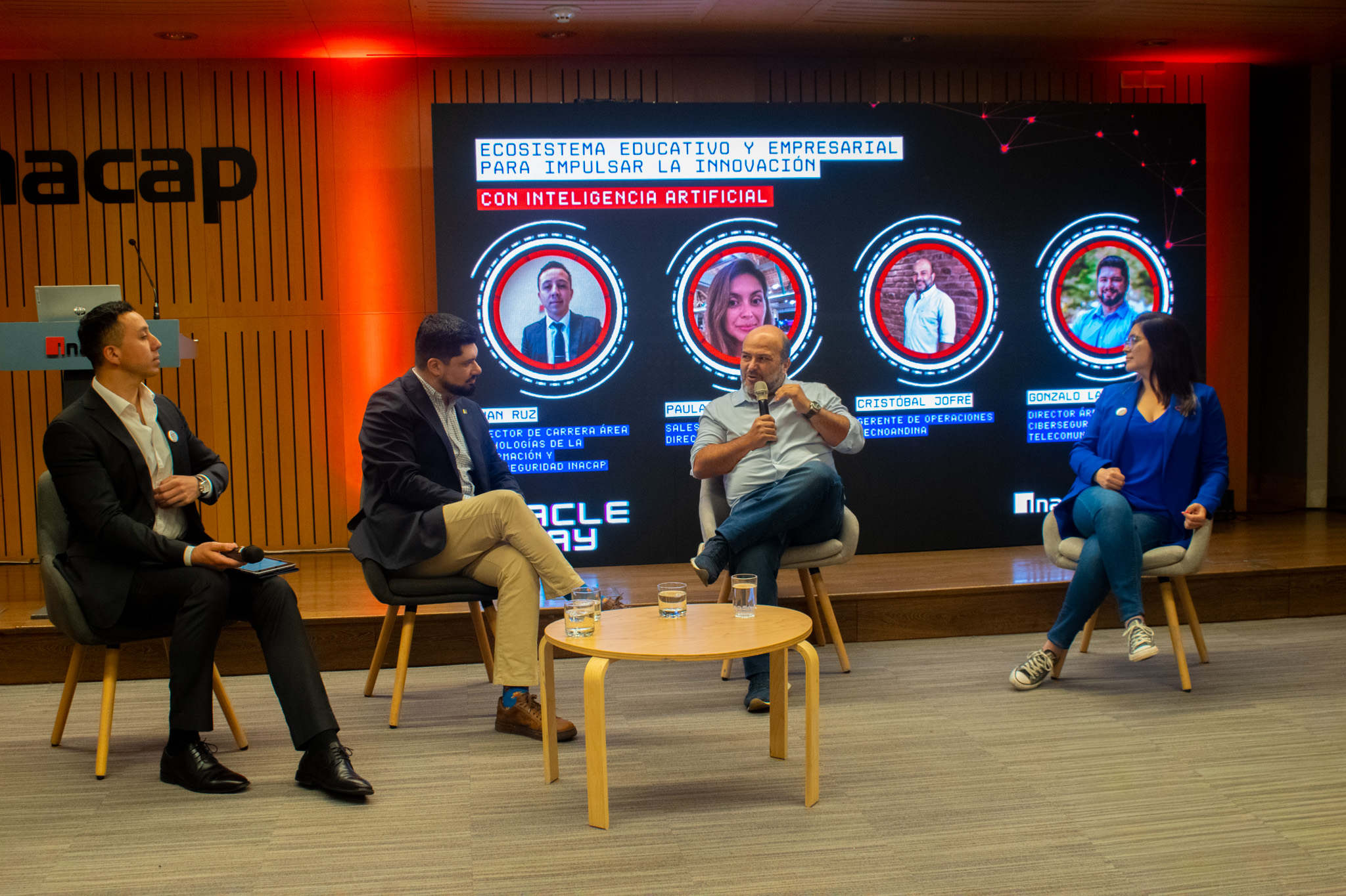 Además, se realizó el conversatorio “Ecosistema educativo y empresarial para impulsar la innovación con IA”, moderado por Juan Ruz, Director de Carrera de Informática y Ciberseguridad de la Sede, y que contó con la participación de Paula Carrillo (Oracle), Cristóbal Jofré (TecnoAndina) y Gonzalo Labra Vidal, Director del Área de Informática, Ciberseguridad y Telecomunicaciones de INACAP.