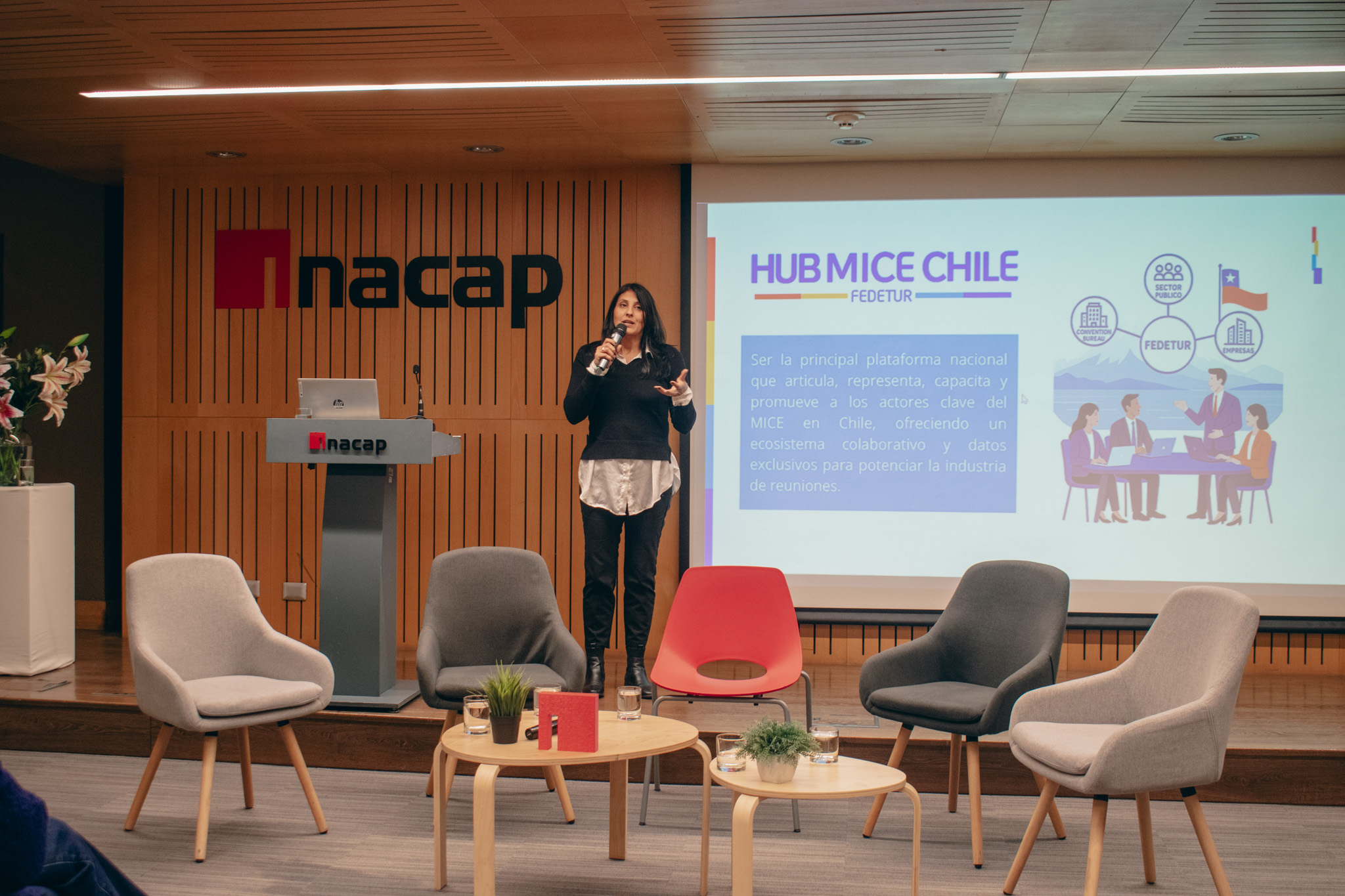 Posteriormente, se desarrolló la charla magistral “Chile como destino MICE: oportunidades de una industria en expansión”, a cargo de Victoria Canales, Gerente de Marketing y Promoción de Fedetur, quien profundizó en el impacto de esta industria y su ecosistema.