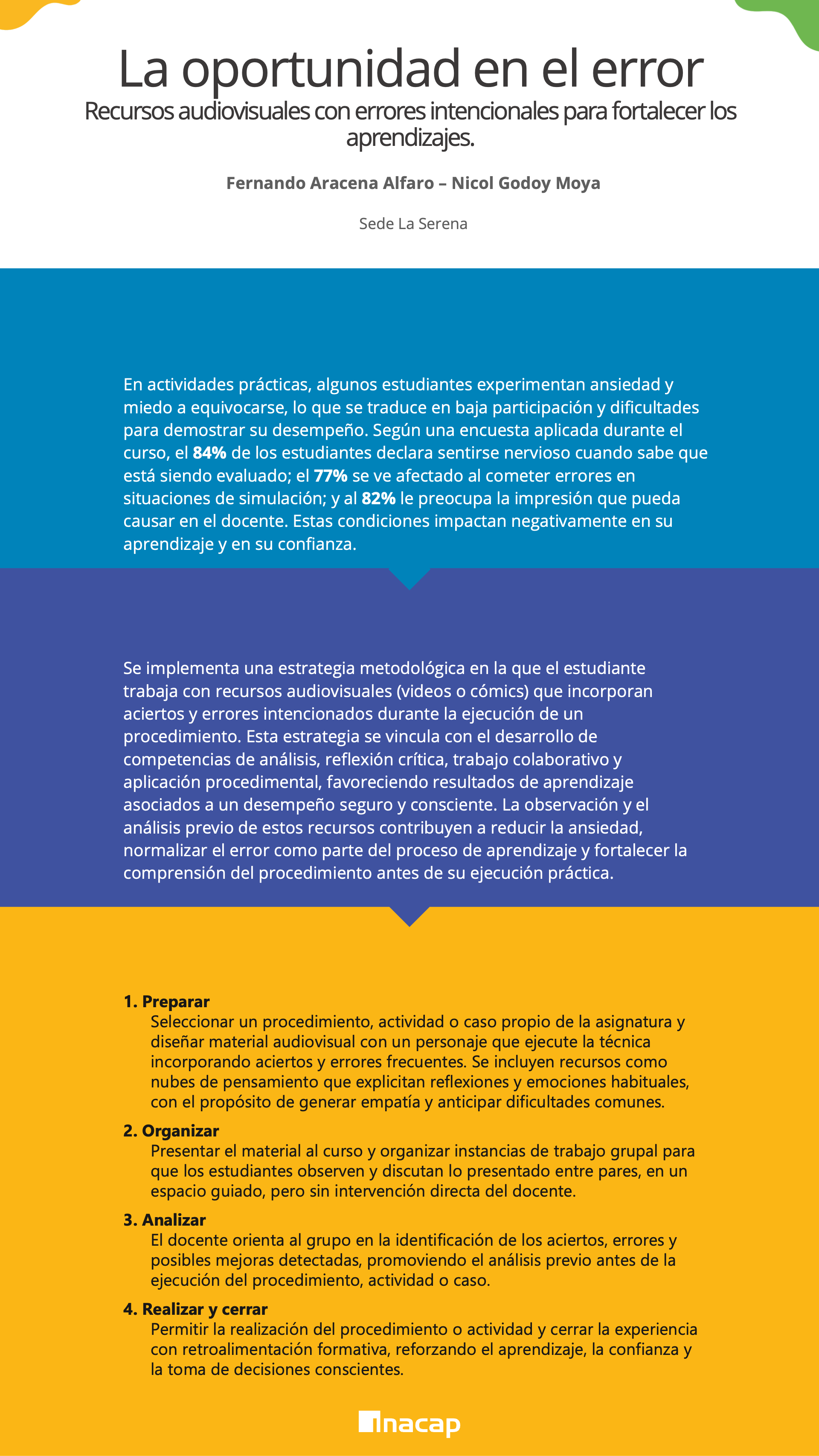 En este video, Nicole Godoy y Fernando Aracena, docentes del área de Salud en sede La Serena, presentan la práctica La oportunidad en el error. Recursos audiovisuales con errores intencionales para fortalecer aprendizajes, una experiencia que resignifica el error como parte central del aprendizaje. A través de videos y cómics que representan procedimientos con errores intencionados, los estudiantes analizan, discuten y validan decisiones en un ambiente seguro antes de ejecutar la técnica. La propuesta fomenta la participación, reduce la ansiedad frente a la evaluación y fortalece la confianza, la comprensión procedimental y el aprendizaje consciente.