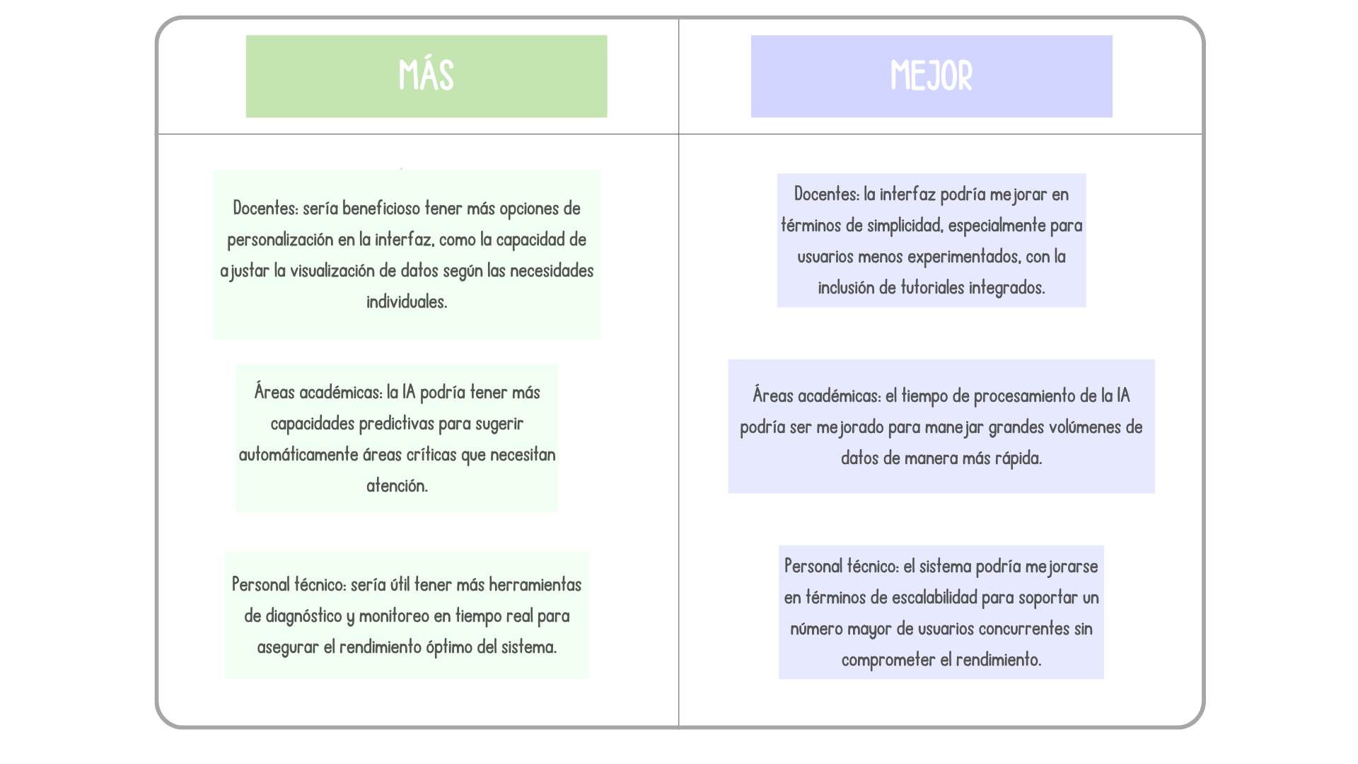 “Incorporar al sistema actual inteligencia artificial y rediseñar la interfaz de usuario. La IA automatizaría el análisis de grandes volúmenes de datos y permitiría gestionar la retroalimentación de manera más eficiente, mientras que la mejora en la interfaz aseguraría que estas herramientas sean accesibles y fáciles de usar para todos los usuarios, lo que facilitaría la toma de decisiones informadas y la comunicación efectiva con los docentes sobre el impacto de sus aportes.”