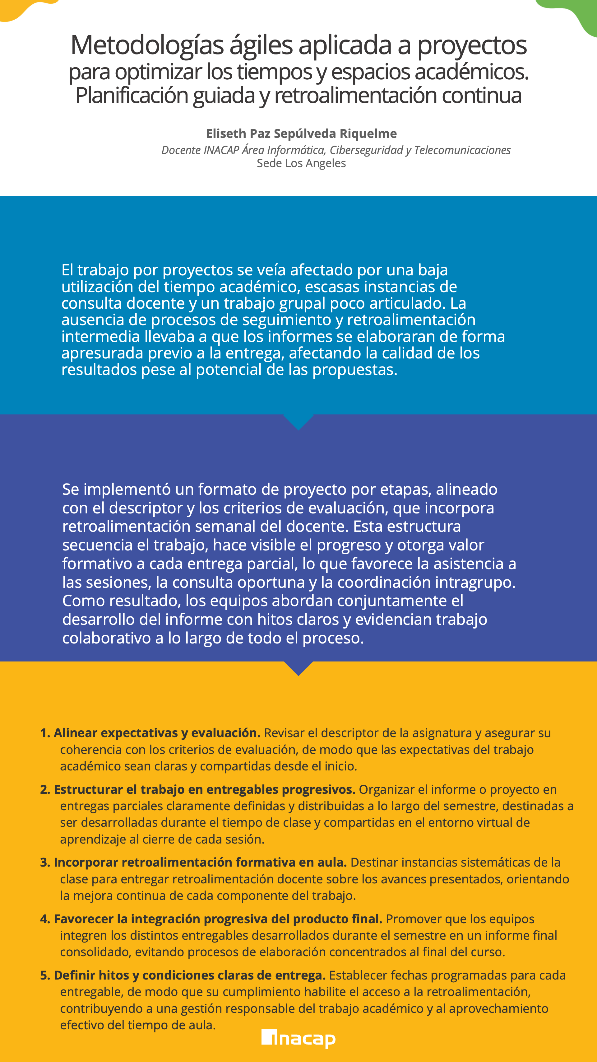 En este video, Eliseth Paz Sepúlveda Riquelme, docente de las áreas de Informática, Ciberseguridad y Telecomunicaciones, sede Los Ángeles, nos presenta la práctica “Metodologías ágiles aplicadas a proyectos para optimizar los tiempos y espacios académicos”, una experiencia basada en planificación guiada, entregables progresivos y retroalimentación continua para mejorar la gestión del trabajo en aula y fortalecer el desarrollo colaborativo de los proyectos.