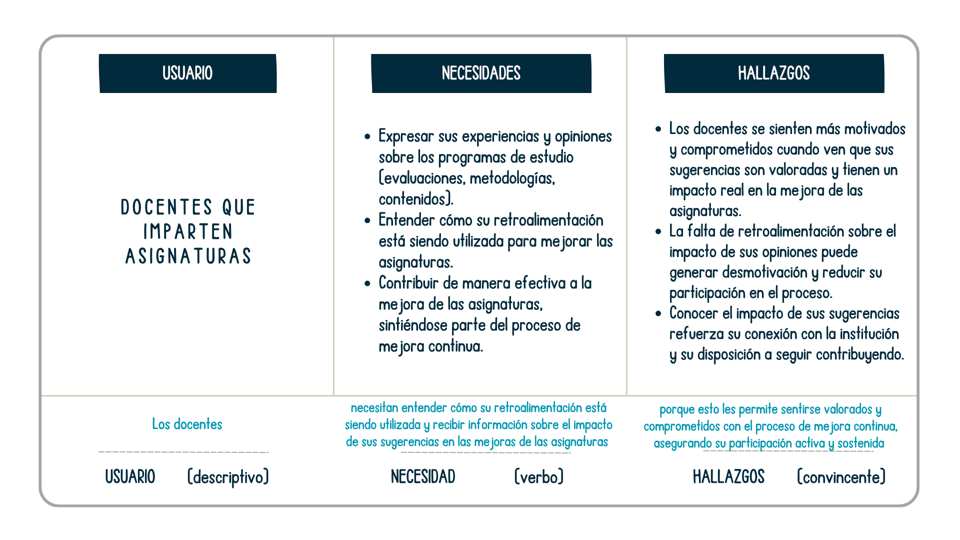 Contexto: el sistema actual para recibir retroalimentación desde los docentes al finalizar la asignatura que imparten no permite que los equipos de gestión académica puedan analizar y gestionar de forma eficiente la información recibida, la cual es clave para identificar necesidades y aplicar los ajustes y mejoras que correspondan en cada asignatura.
