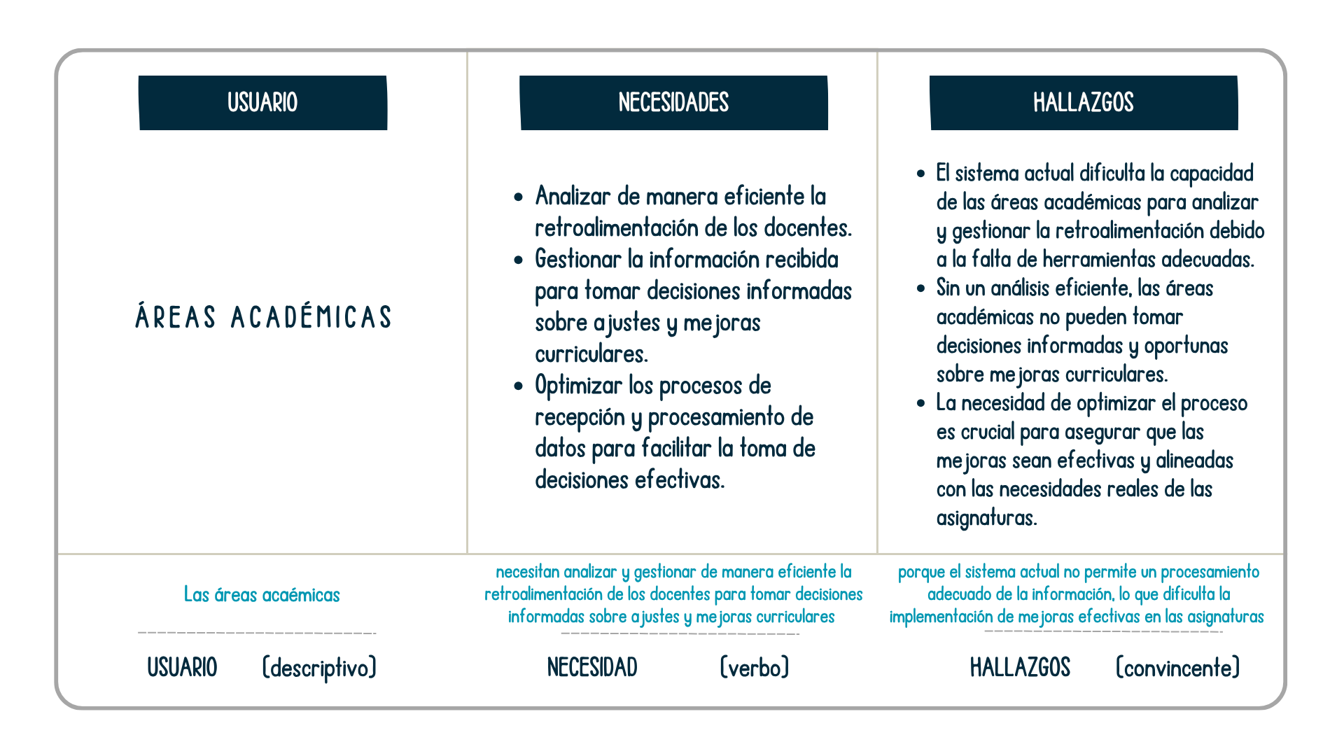 - El sistema actual dificulta la capacidad de las áreas académicas para analizar y gestionar la retroalimentación debido a la falta de herramientas adecuadas.