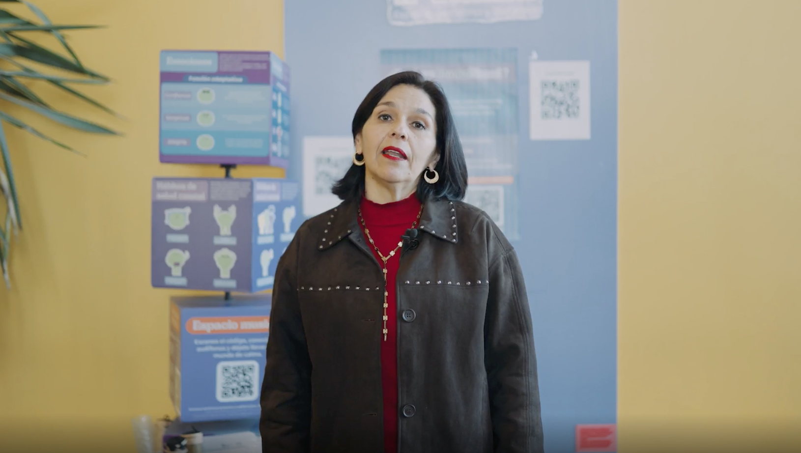 La profesora Ximena Delgado, de INACAP Sede Rancagua, presenta el tótem de autorregulación emocional que diseño e instaló en la sede, como recurso de apoyo a los y las estudiantes para la gestión de la ansiedad y el estrés. La solución incorpora un botiquín emocional, con materiales diversos como palos de agua, mandalas y especies aromáticas, entre otras, que se complementan con la entrega de técnicas de relajación y respiración, hábitos de higiene mental y música especialmente seleccionada.