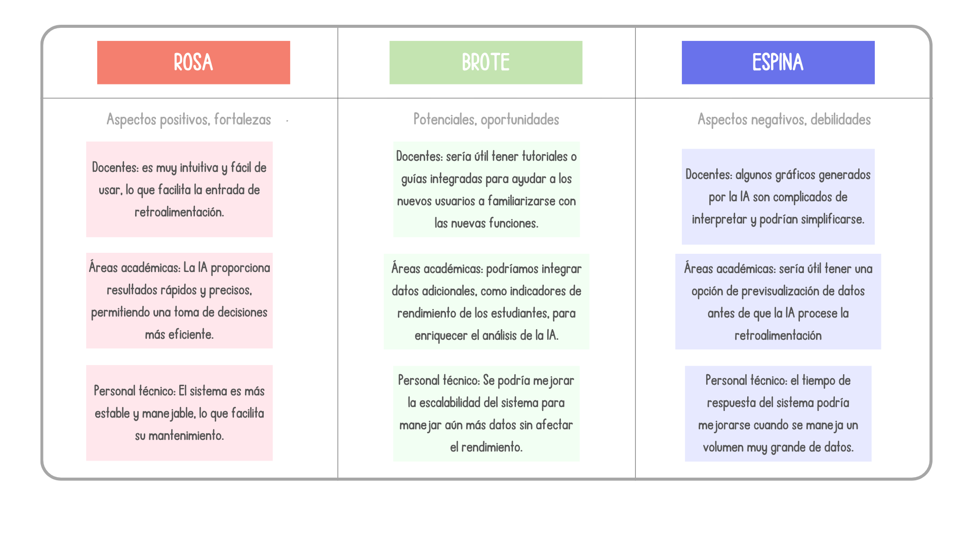- Rosa: fortalezas detectadas en la solución, lo que se considera que va a funcionar de forma adecuada y tendrá un impacto positivo.