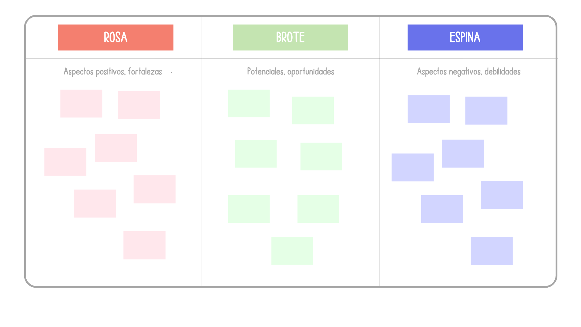 Herramienta visual que categoriza aspectos positivos (rosa), potenciales (brote) y negativos (espina) de proceso, sistema o proceso propuesto. Permite identificar rápidamente problemas y oportunidades de forma resumida y estructurada.